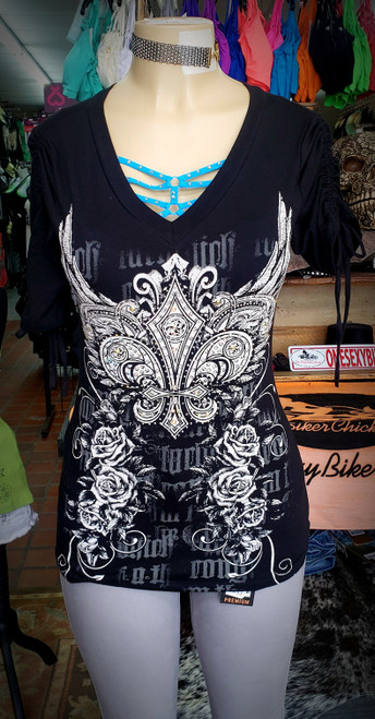 This NEW top from OSBC has all the wants and needs for amazing shirt for any women!!! We Have this beautiful design on the front and back with the Fleur De Lis and flower all overlay with rhinestones. We added on adjustable ties on the arms to let this shirt either be a short sleeve or half sleeve.